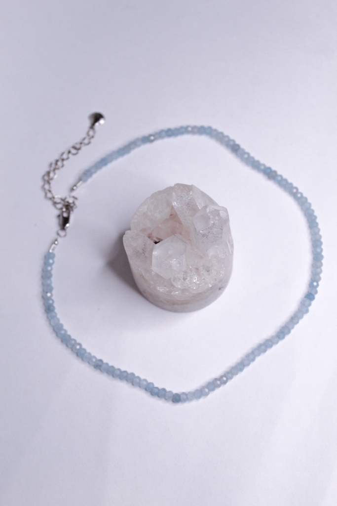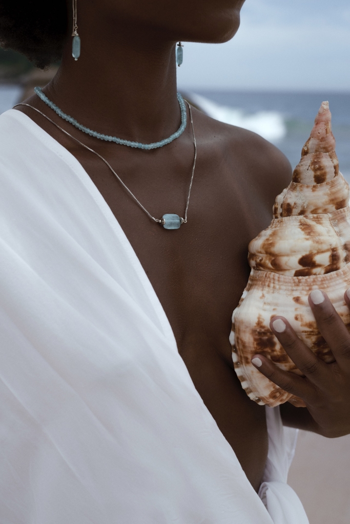 Um convite à leveza e à serenidade, delicadamente confeccionada com micro gemas facetadas de água marinha, uma pedra que carrega a energia das águas profundas e cristalinas do oceano.